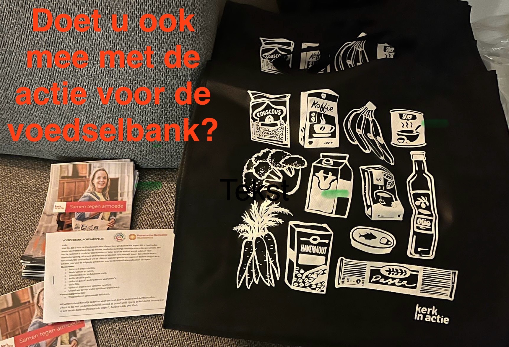 Als diaconie hebben we ons aangemeld bij de actieweek voor de voedselbank georganiseerd door de Protestantse Kerk/Kerk in Actie. Neem gerust een tas mee en lever deze uiterlijk zondag 25 januari 2026 in tijdens de kerkdienst of bij een van de diakenen (Neeltje – Opper 7, Anneke – Alde Dyk 30-d).